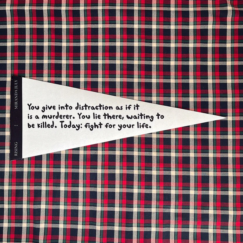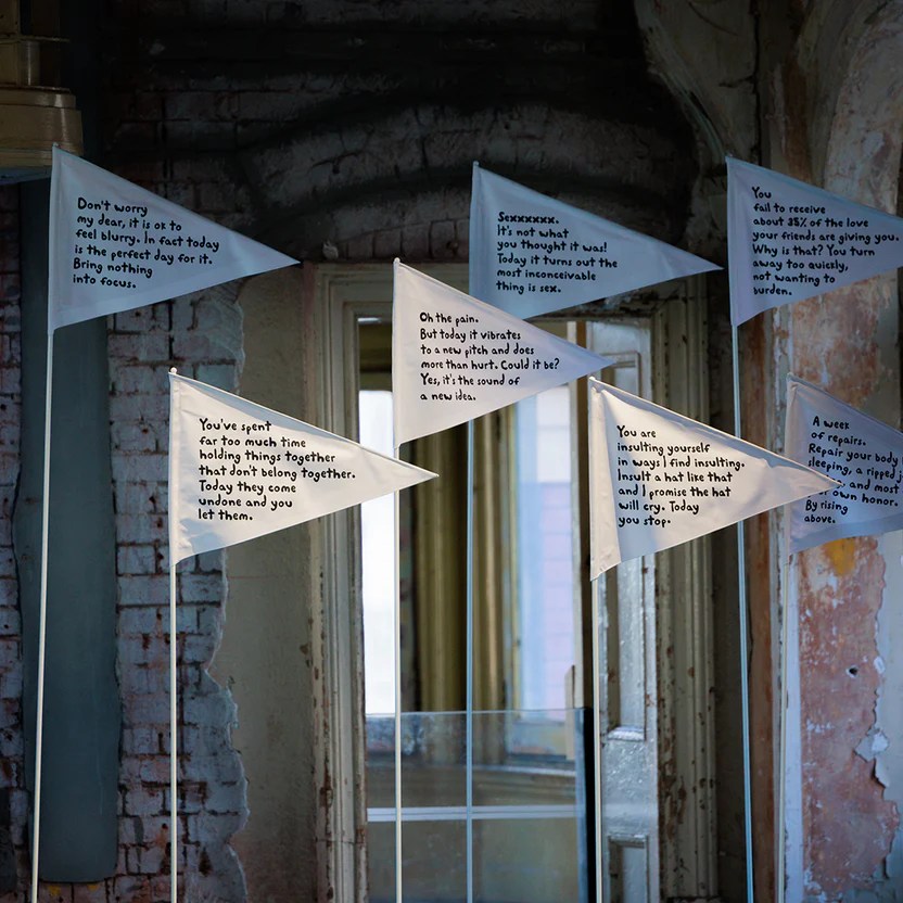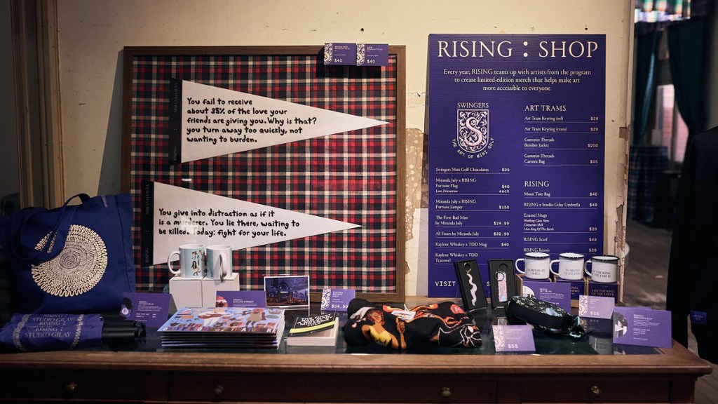 At RISING, I oversee our merchandise production and retail. For Swingers, we produced a few limited-edition items and artist collaborations. We collaborated with US conceptual artist and filmmaker Miranda July on a set of baseball-style pennant flags and a jumper. Both sets of items featured handwritten ‘fortunes’ by Miranda July, that matched the fortunes that formed part of her mini golf hole, and the end of the exhibition.