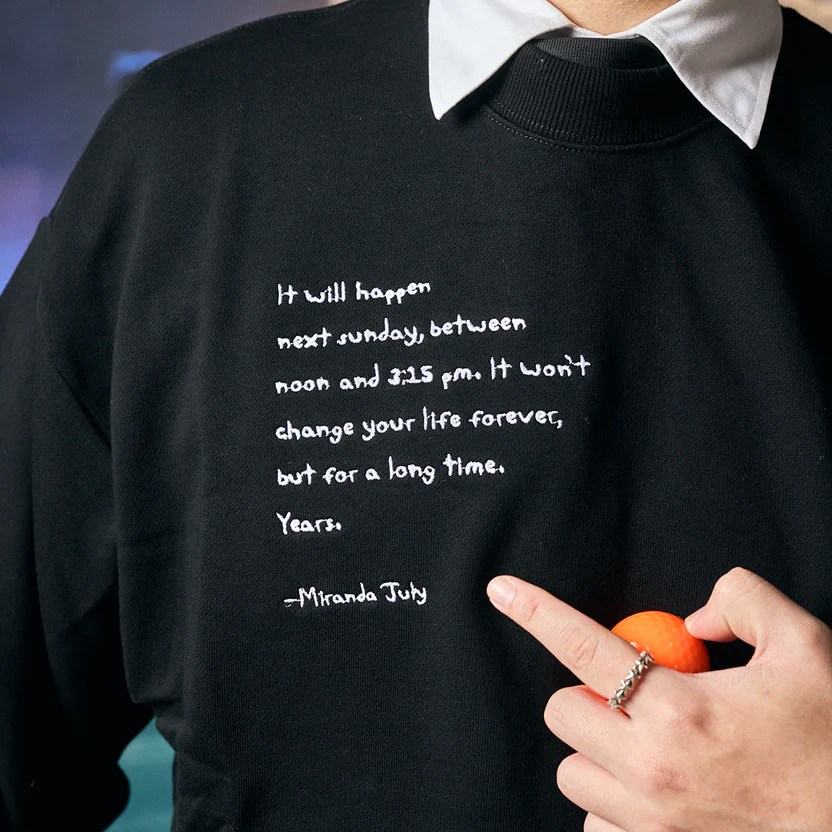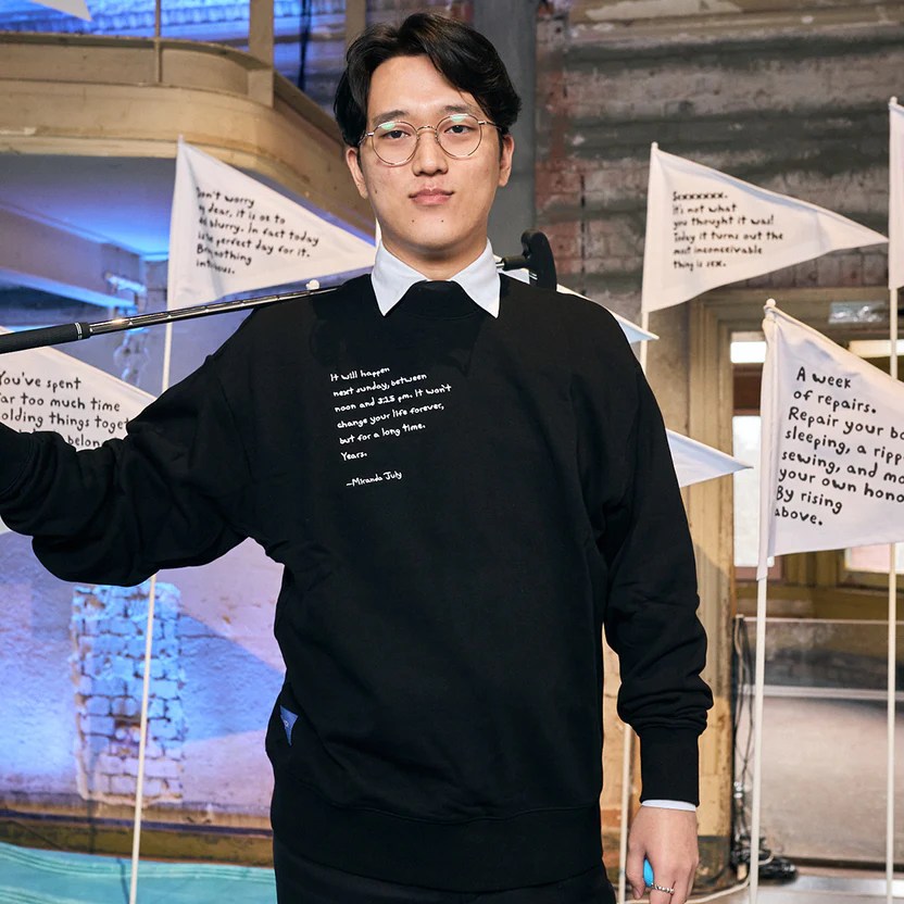 At RISING, I oversee our merchandise production and retail. For Swingers, we produced a few limited-edition items and artist collaborations. We collaborated with US conceptual artist and filmmaker Miranda July on a set of baseball-style pennant flags and a jumper. Both sets of items featured handwritten ‘fortunes’ by Miranda July, that matched the fortunes that formed part of her mini golf hole, and the end of the exhibition.